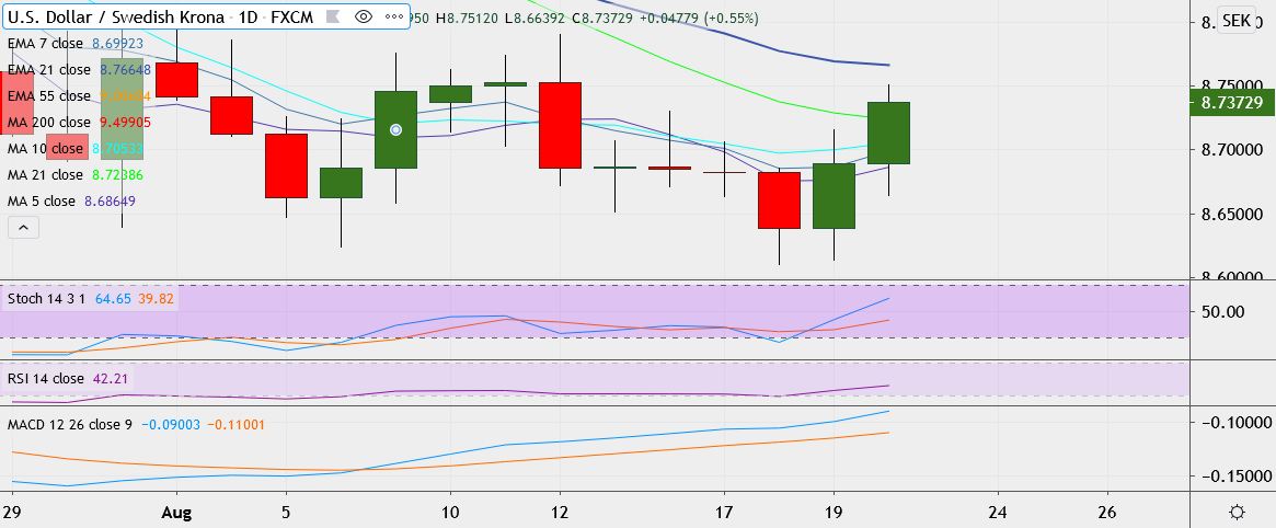 - Immediate resistance is located at 8.7694 (21-EMA), any close above could take it near 8.7902.