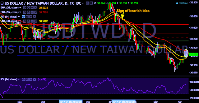 We prefer to take long position in USD/TWD only above 30.62, stop loss 30.50 and target of 30.97.