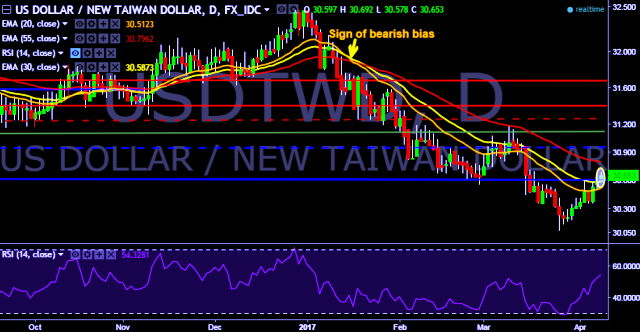 We prefer to take long position in USD/TWD around 30.62, stop loss 30.50 and target of 30.97.