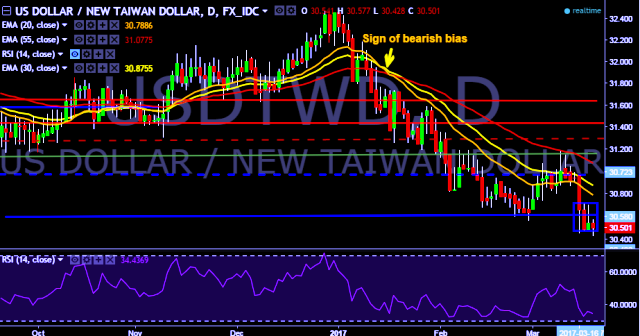 We prefer to go short on USD/TWD around 30.55 with stop loss at 30.72 and target of 30.35.