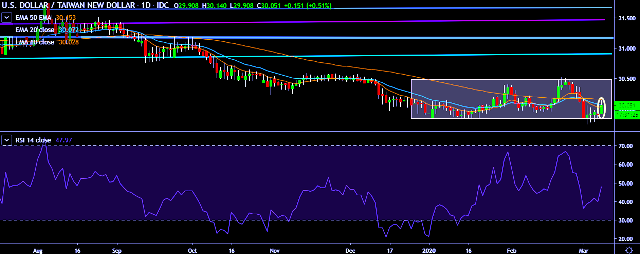 We prefer to take long position on USD/TWD only above 30.17, stop loss at 29.87 and target of 30.28/30.50.