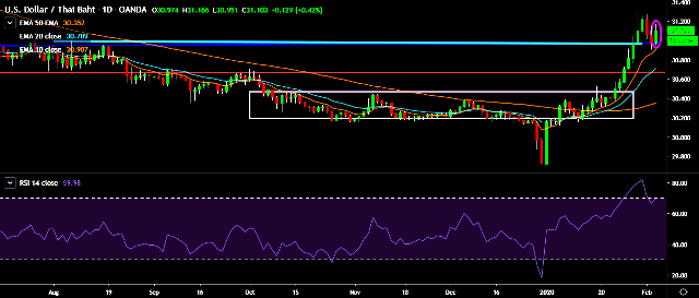 We prefer to go long on USD/THB around 31.00, stop loss at 30.87 and target of 31.25/31.37.