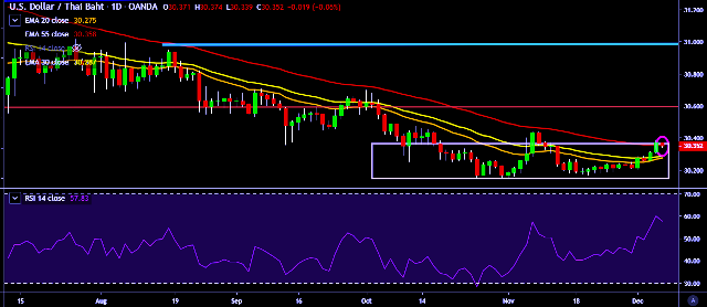 We prefer to go long on USD/THB only above 30.37, stop loss at 30.30 and target of 30.72.