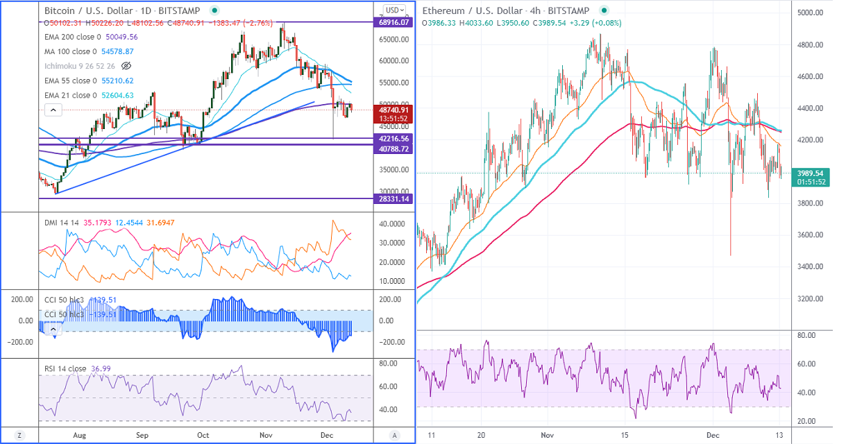 BTCUSD showed a minor pullback but struggled to hold above 200- day EMA. It is still below the psychological support of $50000 and is currently trading around $48857.