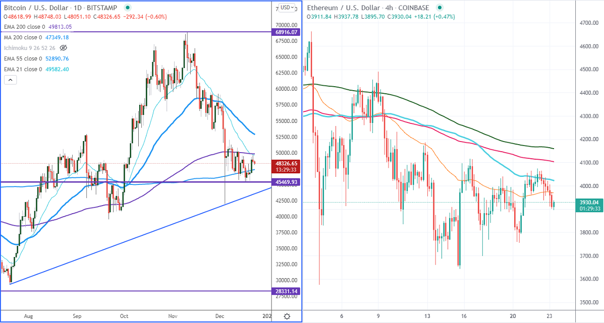 Levels to watch- $47280 (200-day MA). Any convincing break below will drag the Bitcoin to the next level of $45000/$41967 (Dec 4th low)/$40000. Major demand zones are $39759, $37600. A breach below $37000 will pull the BTC to 2021 low $28600.