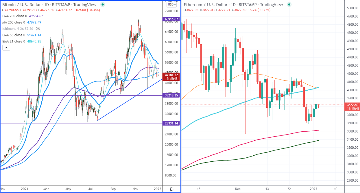 Levels to watch- $3860. Any close below will drag the ETH to near-term support of $3750/$3650/$3470 (Dec 4th low)/$3303 (200- day MA). Major demand zones are $3200. Breach below $3200 targets $3000/ $2650 (Sep 2021 low).