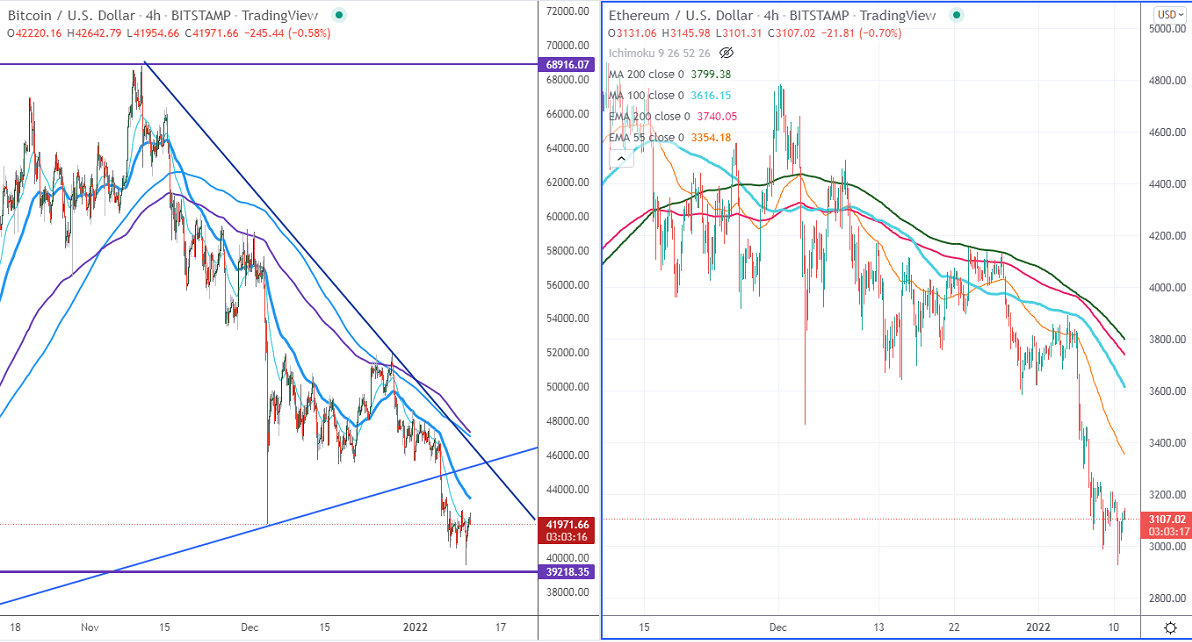 BTCUSD has formed a double bottom around $39500 and shown a minor pullback. The pair has regained above $40000 after a sell-off of nearly $30000. It hits a low of $39558 at the time of writing and is currently trading around $42140.