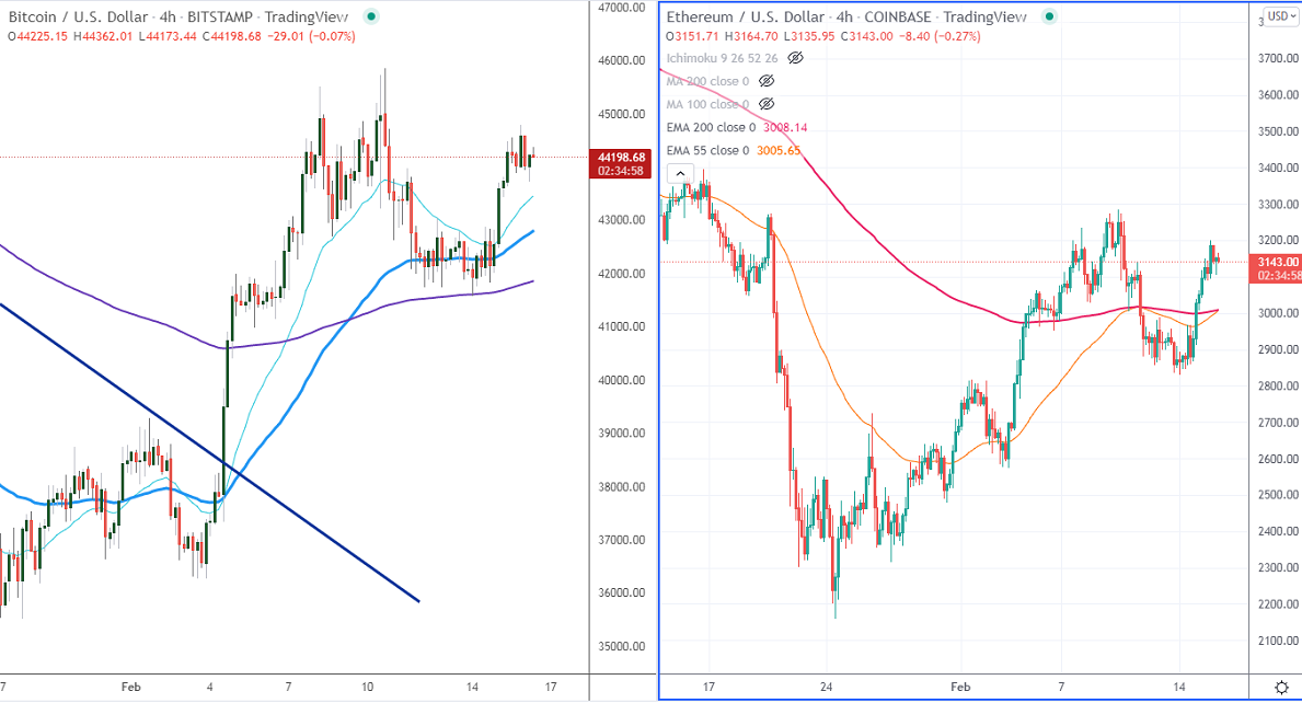 BTCUSD gained above $44000 as demand for riskier assets returned. The pair hit a low of $41575 after Russia and Ukraine tension escalated. It hits an intraday high of $44785 and is currently trading around $44214.