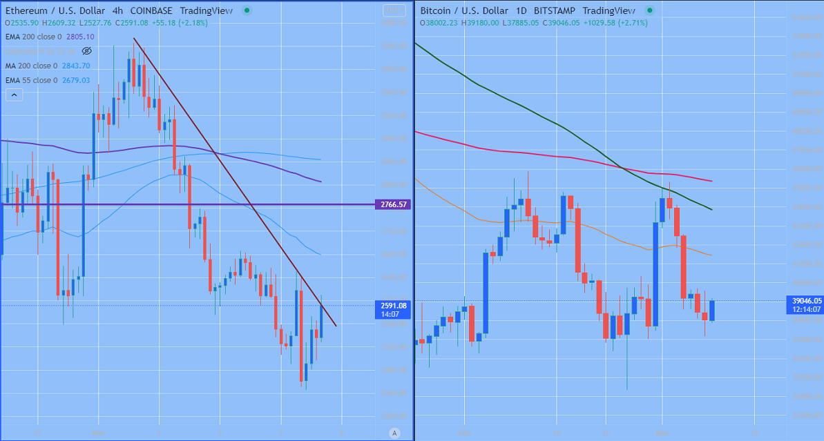 ETHUSD regained above $2500 from a low of $2445. It hits a high of $2609 at the time of writing and is currently trading around $2572.40.