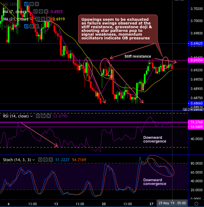 Technical chart and candlestick patterns: In the minor trend, the prevailing upswings of AUDUSD seem momentary as the failure swings were observed at 0.6935 level which has been acted as the stiff resistance.