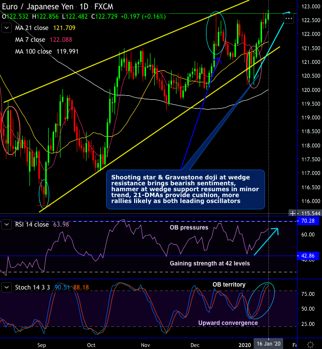 Hence, on trading perspective, at spot reference: 122.747 levels, contemplating above technical rationale it is advisable to trade one-touch calls to participate in prevailing rallies, using upper strikes at 123.150 levels.