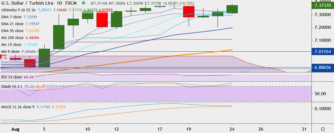 - USD/TRY is trading 0.8 percent higher at 7.3751, having hit an record high of 7.3980 last week.