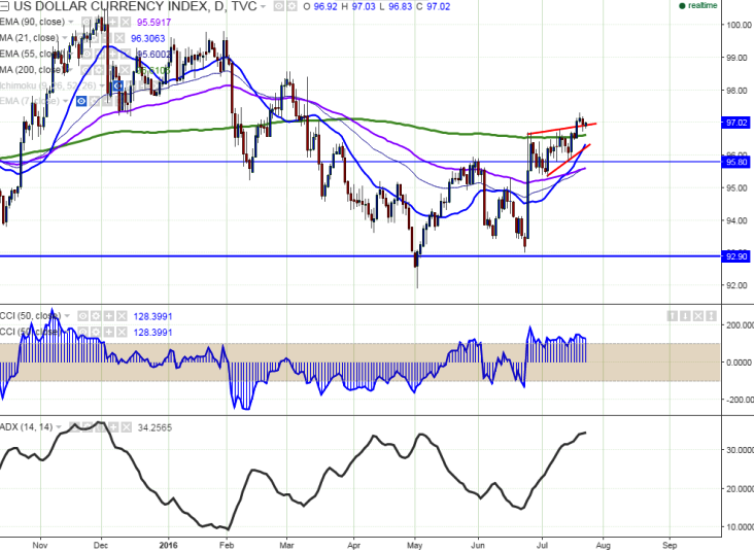 - The index has formed temporary top around 97.32 and it should break above 97.32 for further bullishness. Any break above 97.32 will take the index to next level at 98/98.60/99 in the short term.