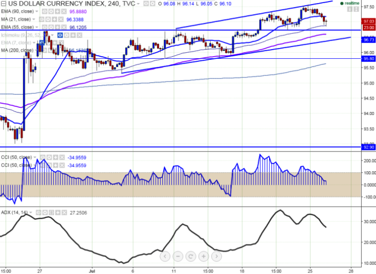 - Short term trend is slightly bearish as long as resistance 97.60 holds. Any break above 97.60 will take the index till 98.25/98.40 in the short term.