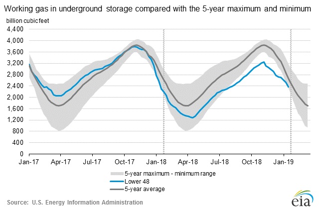 According to the latest numbers, working gas in underground storage remains at 2.37 trillion cubic feet (Tcf). Stocks are 33 Bcf higher than last year at this time and 305 Bcf below the five-year average. The chart from EIA shows the level of inventory. The second chart from investing.com shows weekly changes in inventory.