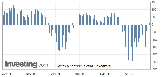 According to latest numbers, working gas in the underground storage remains at 2.061 trillion cubic feet. The chart from EIA shows the level of inventory. The second chart from investing.com shows weekly draws in inventory.