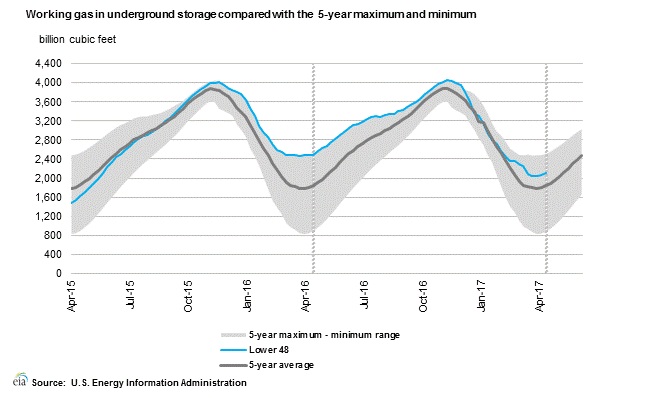 According to latest numbers, working gas in the underground storage remains at 2.115 trillion cubic feet. The chart from EIA shows the level of inventory. The second chart from investing.com shows weekly draws in inventory.