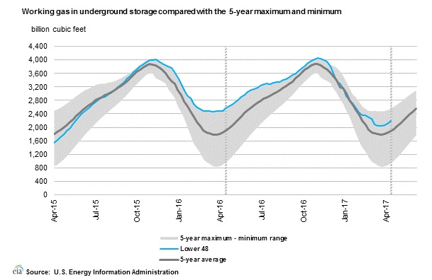 According to latest numbers, working gas in the underground storage remains at 2.189 trillion cubic feet. The chart from EIA shows the level of inventory. The second chart from investing.com shows weekly draws in inventory.