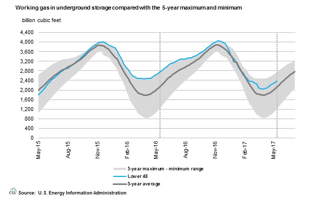 According to latest numbers, working gas in the underground storage remains at 2.369 trillion cubic feet. The chart from EIA shows the level of inventory. The second chart from investing.com shows weekly draws in inventory.