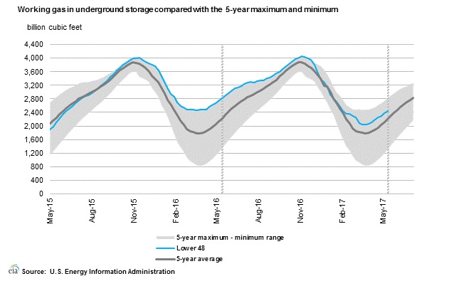 According to latest numbers, working gas in the underground storage remains at 2.444 trillion cubic feet. The chart from EIA shows the level of inventory. The second chart from investing.com shows weekly draws in inventory.