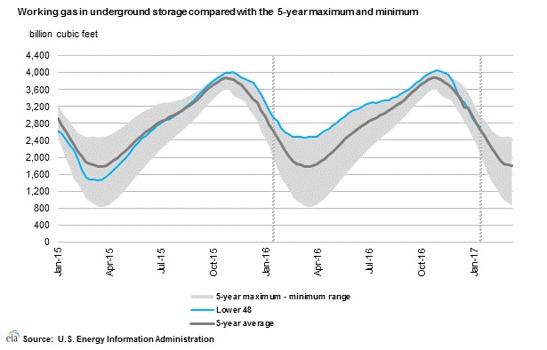 - According to latest numbers, working gas in the underground storage remains at 2.711 trillion cubic feet. The chart from EIA shows the level of inventory. The second chart from investing.com shows weekly draws in inventory and that clearly shows that we are past the peaks, and from now on the inventory draws would slow down.