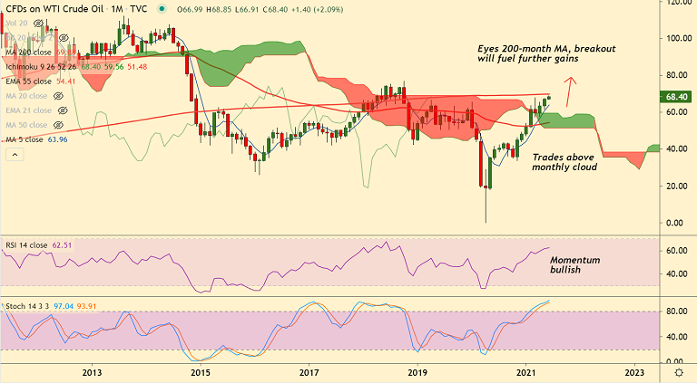 Oil prices are on track to test 200-month MA at $69.88. Breakout above 200-month MA will propel prices higher.