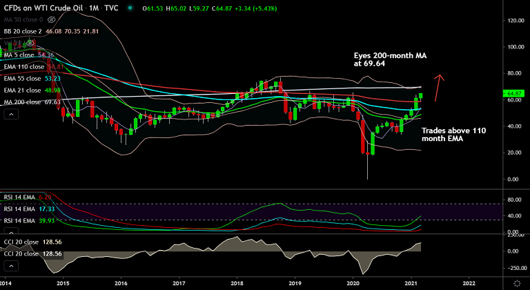 West Texas Crude Oil prices navigate YTD highs above $65.00, inches closer towards 200-month MA at 69.63.