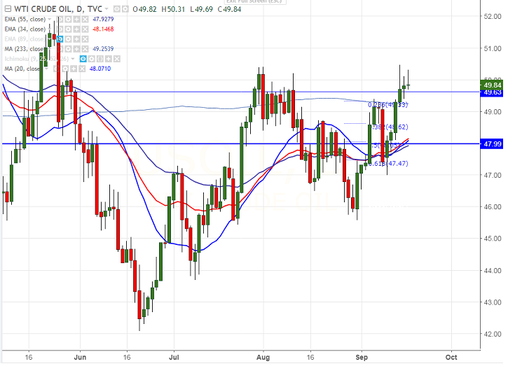 - WTI finished the up 5.08% on rising refinery demand and falling rig count. The commodity has broken major resistance $50.40 high made on Sep 1st 2017 and jumped till $50.47 on Friday. It is currently trading around $49.86.