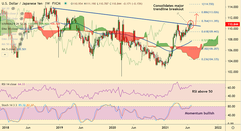 Major technical bias for the pair remains bullish as price action consolidates break above major trendline resistance.