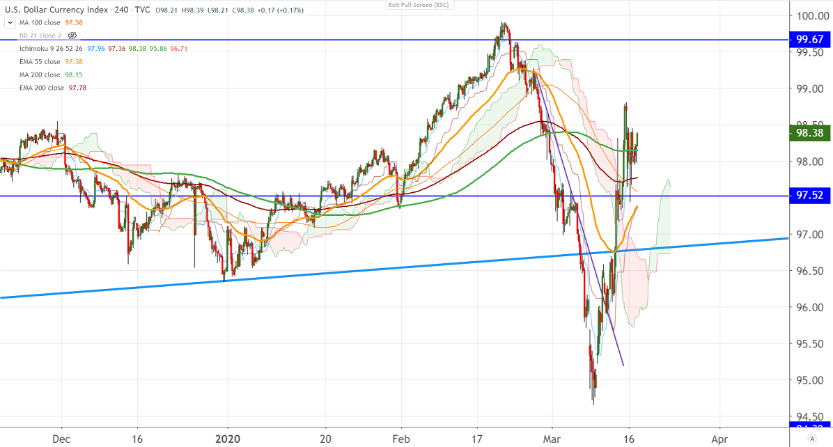 DXY is trading highly volatile in the past two days. The index is showing a movement of 100 pips per day as markets getting panic due to coronavirus. It has formed a minor bottom around 97.45 and jumped to 98.45. It is currently trading around 98.14.
