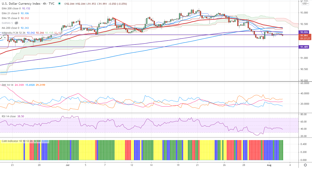 DXY is trading weak for a second consecutive week on board-based US dollar selling. The dovish comments from Fed and weak US economic data are dragging the US dollar down. The decline in US bond yields also putting pressure on the US dollar index The US ISM for July came at 59.50 below the estimate of 60.4.