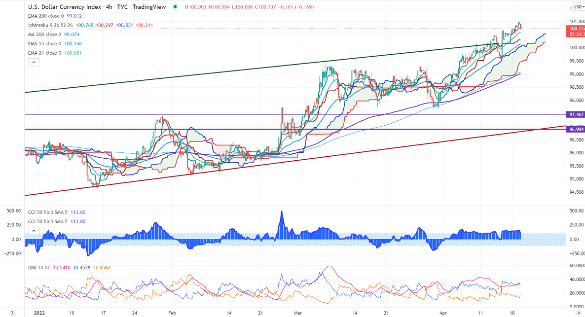 DXY trades higher for a third consecutive week and hits the highest level since Apr 2020. The hawkish stance by Fed officials pushed the US dollar further higher. According to the CME Fed watch tool, the probability of a 50 bpbs rate hike in May increased to 91.05% from 84.9% a week ago. It hits a high of 101.02 and is currently trading around 100.71.