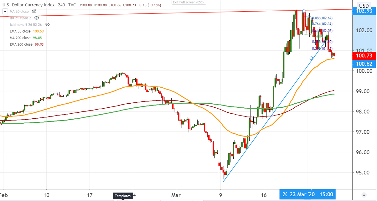 As per our analysis, DXY is trading weak for the past 2 trading days. It has formed a temporary top around 102.99 and lost more than 150 pips. The U.S Senate has passed a $2tn coronavirus disaster bill and send it to the house where it will get approved on Friday. This stimulus has decreased demand for safe-haven assets like USD, Yen. It hits a low of 100.65 and is currently trading around 100.75.