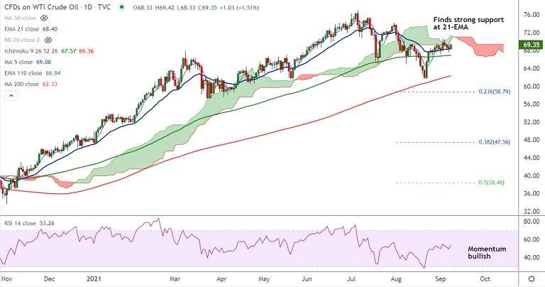WTI has paused downside after 3 consecutive days of declines, finds strong support at 21-EMA at 68.39.