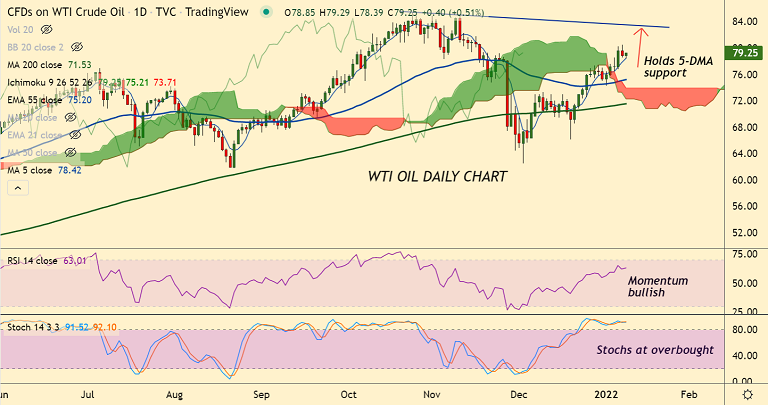 Support levels - 78.41 (5-DMA), 77.12 (200H MA), 75.64 (21-EMA)