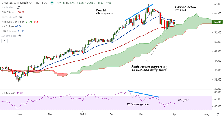 From a technical perspective, WTI has held support at 55-EMA and any major weakness only on break below.