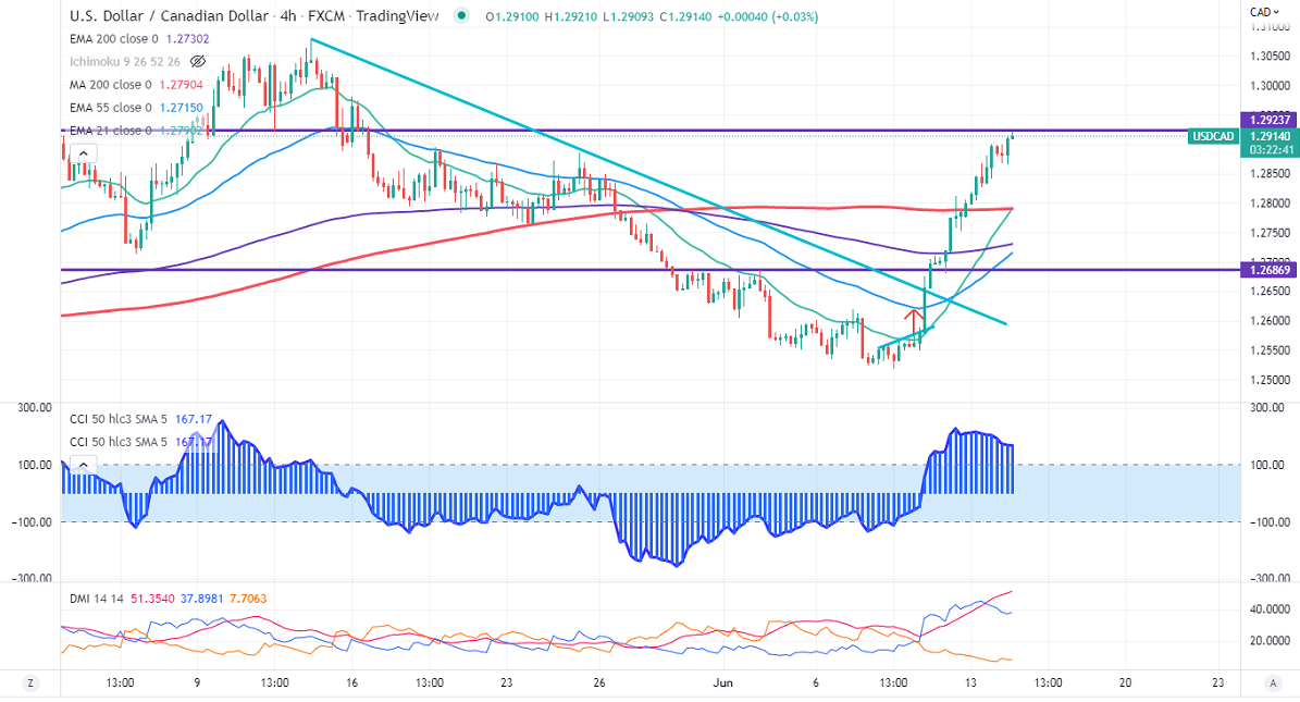 USDCAD gained sharply yesterday on dollar strength. US dollar index hits 20-year high on hopes of aggressive rate hikes by Fed. According to the CME Fed watch tool, the probability of a 75 bpbs rate hike in Jun increased to 95.3% from 3.1 % a week ago. Technically in the 4-hour chart, the pair is holding above the short-term (21- and 55 EMA) and long-term moving average of 200 MA (1.2790). Any close below 1.2860 confirms intraday bearishness. A dip to 1.2800/1.2730/1.2680 is possible. USDCAD hits an intraday low of 1.29210 and is currently trading around 1.29163.