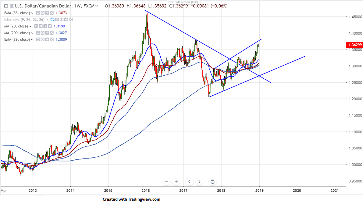USDCAD was one of the top performer in year 2018. The pair has jumped nearly 8% this year on account of weak oil price and dovish Bank of Canada statement. It hits high of 1.36615 and is trading around