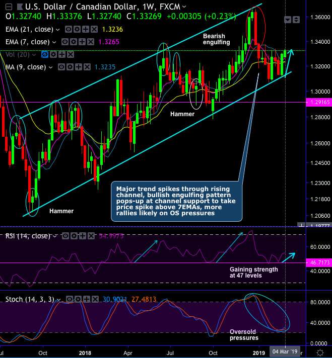 On a broader perspective, the bullish engulfing candle has occurred exactly at channel support at 1.3296 levels, ever since then bulls managed to nudge prices above EMAs from last three-four weeks.
