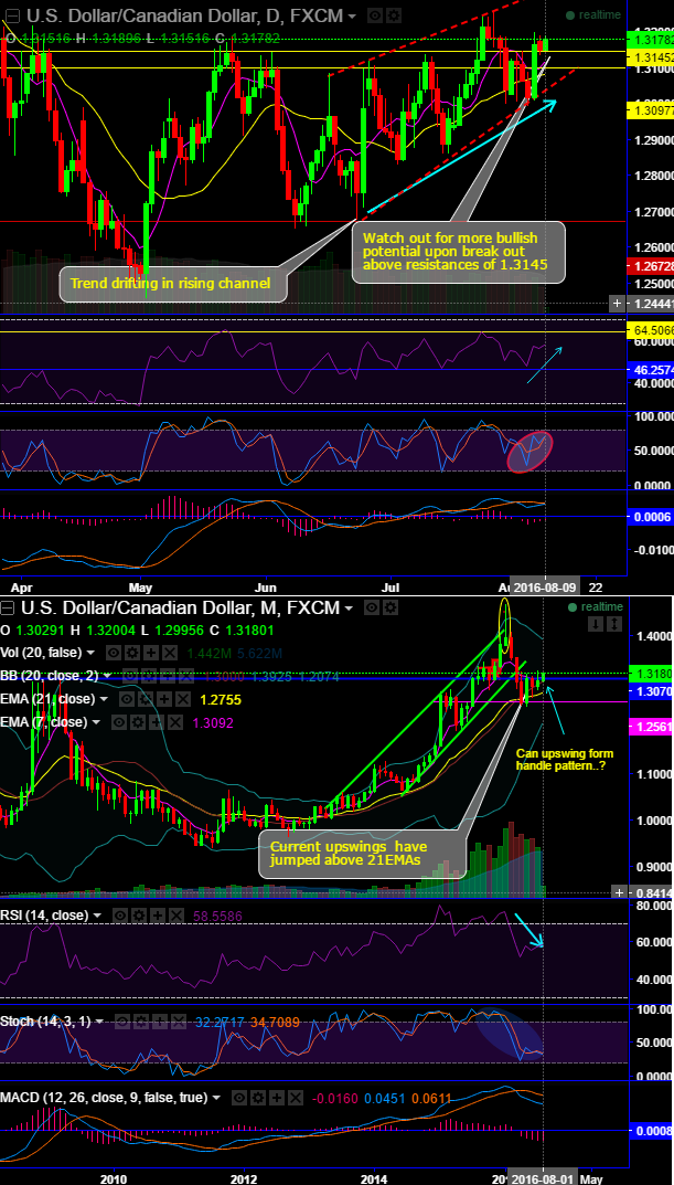 Upswings in USDCAD spiked above DMAs after breaking resistances at 1.3145.