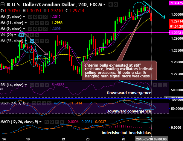 Shooting star has occurred at 1.3009 and the hanging man at 1.3026 levels on USDCAD’s daily chart. As a result, the price tumbles below DMAs with bearish MACD crossovers.