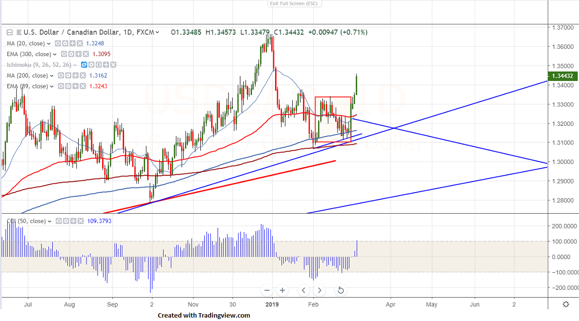 USD/CAD is trading higher for 5th consecutive day and jumped more than 100 pips for the day after dovish BOC monetary policy.Bank of Canada has kept its interest rates unchanged at 1.75%.BOC Governor expects that rates will be hold for a while and there might of chance of rate cuts if growth declines further.The pair hits intraday high of 1.34573 and is currently trading around 1.34428.