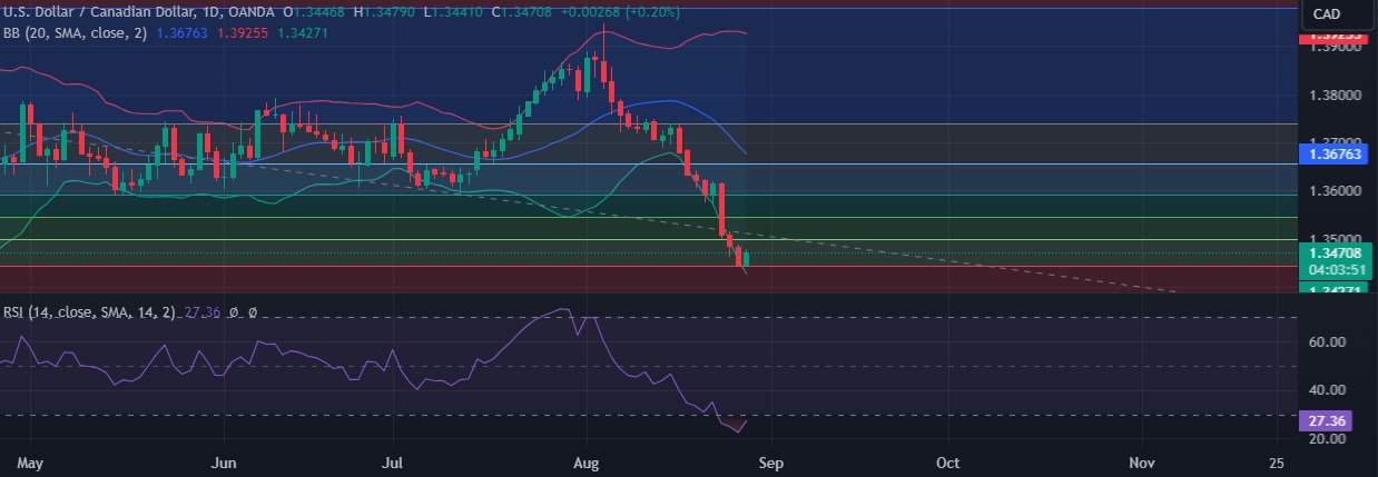 • Support is seen at 1.3440(23.6%fib) and break below could take the pair towards 1.3424(Lower BB).