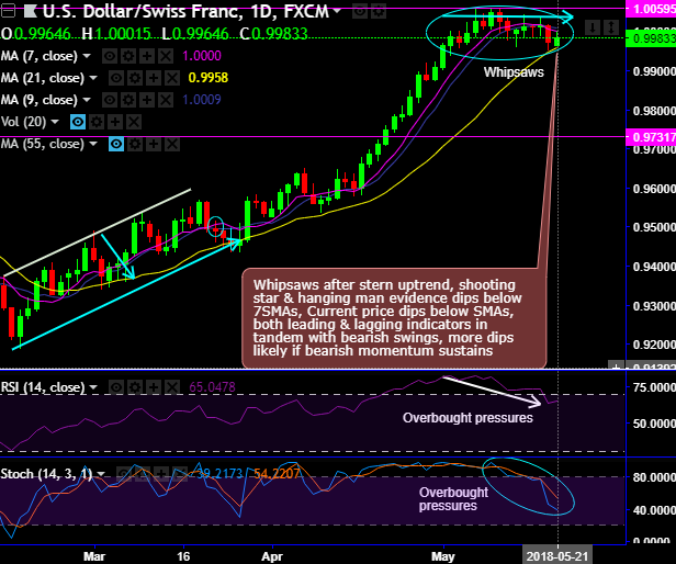 USDCHF forms shooting stars at 0.9994, 1.0025 and 1.0024 levels, hanging man patterns at 1.0025, 1.0003 and 1.0004, doji patterns at 1.0012 and 1.0014 levels that restrain rallies below 7SMAs, the current price remains below SMAs (refer daily chart).