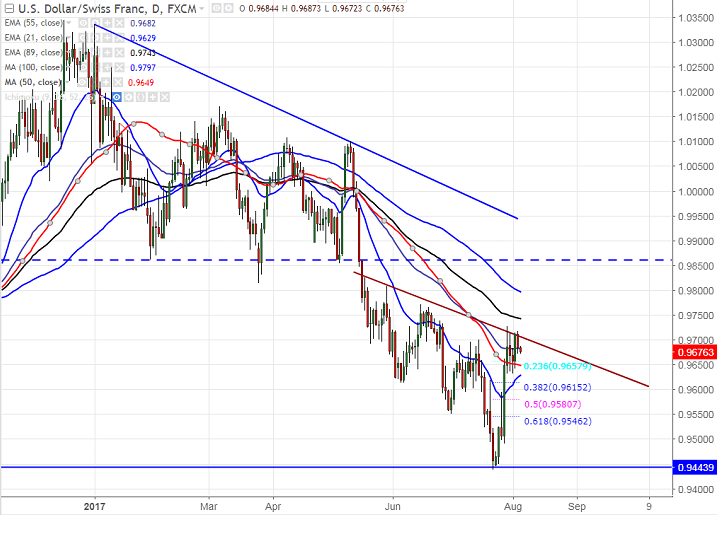 - The pair minor bullishness can be seen only above 0.97260 (trend line joining 0.98252 and 0.9808) and any break above will take the pair till 0.9785 (38.2% retracement of 1.03432 and 0.9435)/0.9808 (May 30th 2017 high).