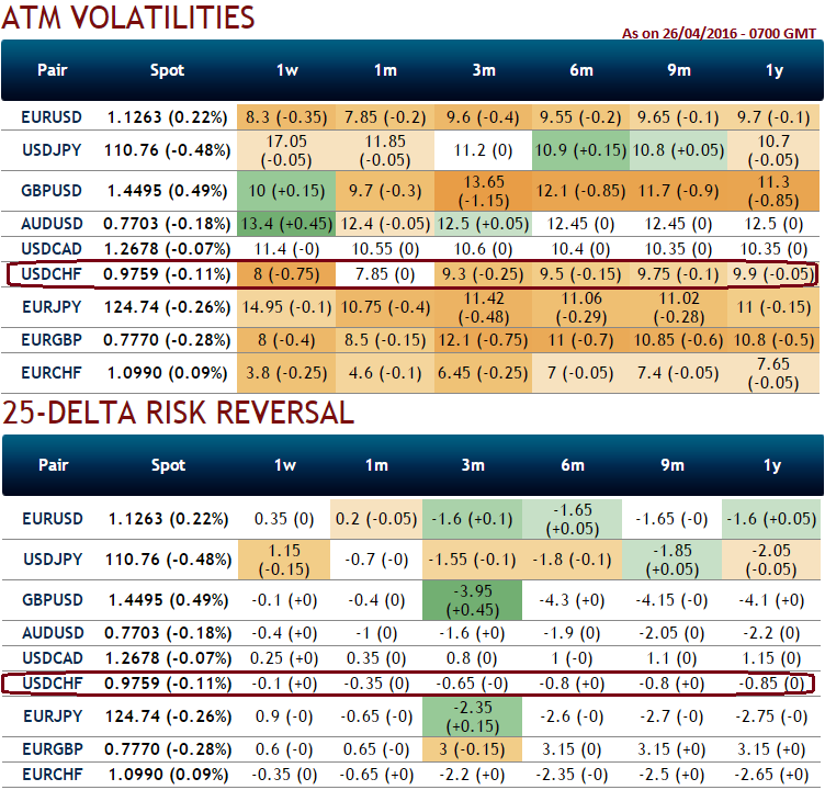 Contemplating on technicals, IVs and risk reversals USDCHF’s bear swings have to go in narrow range, as result we could foresee the range bounded trading opportunity in prevailing range of 1.0096 and 0.96 levels in short term.