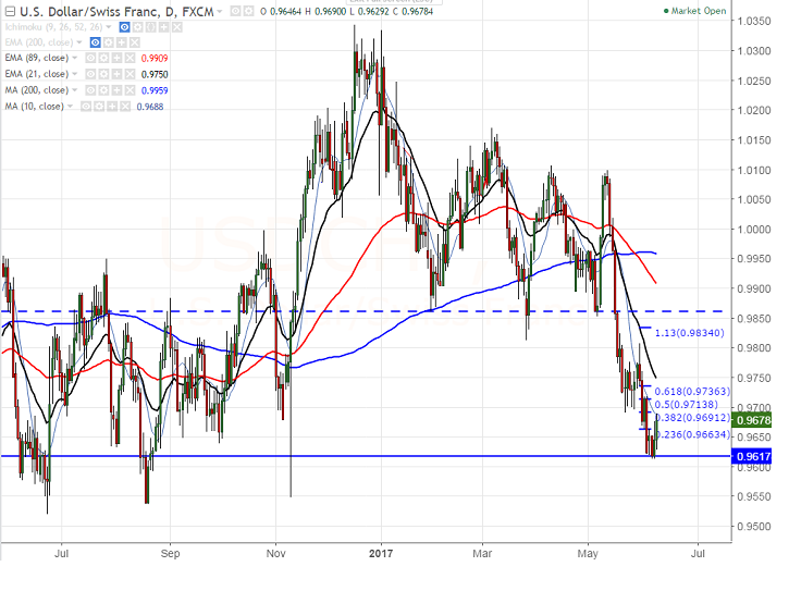 - In the hourly chart the pair is trading slightly above hourly Tenkan-Sen and Kijun-Sen. Short term bearish invalidation can be seen only above 0.9808.Any break above 0.9808 high made on May 30th 2017 will take the pair till 0.9835 (38.2% retracement of 1.00998 and 0.96220)/0.9900/0.9925 (50- day MA). The minor resistance is around 0.9700 (200- H MA)/0.97360 (61.8% retracement of 0.9808 and 0.96220).
