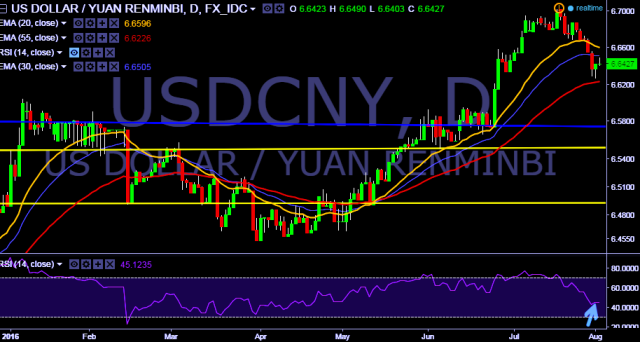 We prefer to take long position in USD/CNY around 6.6410, stop loss 6.6268 and target 6.6558/6.6700.