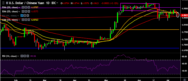 We prefer to take short position in USD/CNY around 6.87, stop loss at 6.8870 and target of 6.8492/6.8331.