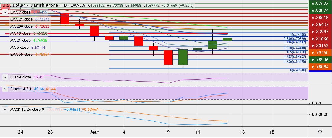- USD/DKK is trading 0.1 percent up at 6.6905, having hit high of 6.7599 on Thursday, its highest since March 2.